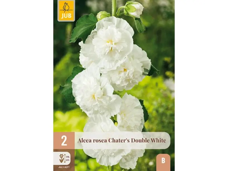 De Alcea rosea 'Double White' (stokroos) is een indrukwekkende, hooggroeiende plant van 100-175 cm met stevige stelen en grote, witte bloemen. Perfect als verticale blikvanger langs een huis, schutting of in de border.