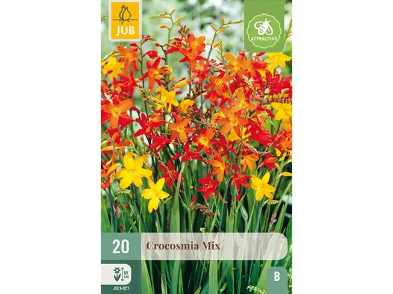 Een Crocosmia-mix is een kleurrijke samenstelling van verschillende Crocosmia’s die bijzonder geschikt is voor de border. De bloemen, die verschijnen van juli tot en met oktober, vallen sterk op tussen andere tuinplanten en zorgen voor een levendig geheel. Crocosmia ‘Mix’ bereikt een hoogte van ongeveer 50 tot 60 centimeter en groeit het beste op een zonnige standplaats. De bloemen zijn bovendien goed te gebruiken als snijbloem.