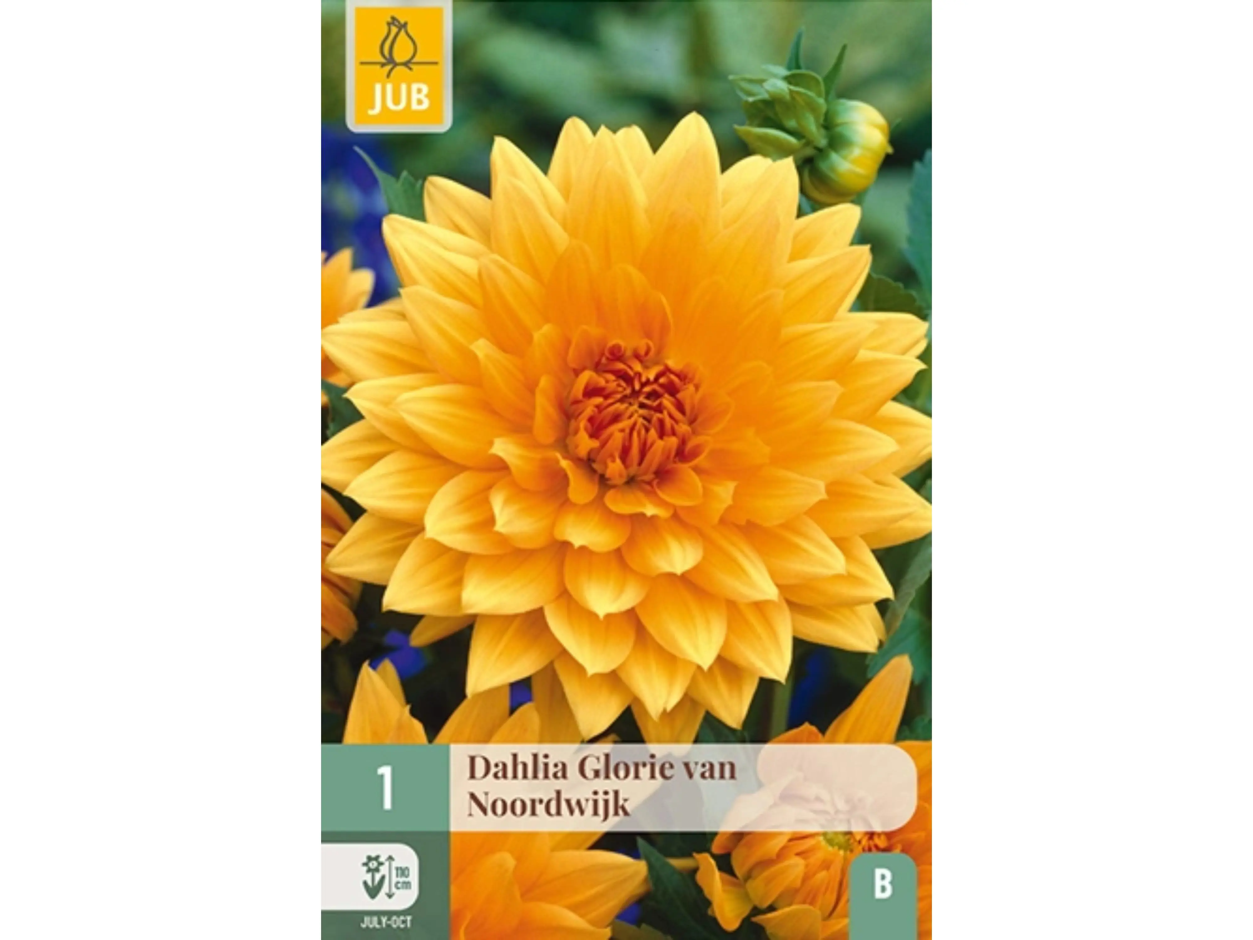 De grootbloemige, decoratieve Dahlia ‘Glorie van Noordwijk’ is een dankbare zomerbloeier die van juli tot aan de eerste nachtvorst je tuin opfleurt met schitterende oranje bloemen. De plant wordt ongeveer 100–110 cm hoog en heeft soms een steuntje nodig voor de stengels.