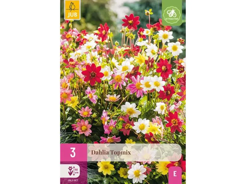 De dahlia mix ‘Topmix’ is een kleurrijke en dankbare zomerbloeier die van juli tot de eerste nachtvorst voor maandenlang plezier zorgt. Met een hoogte van ongeveer 50 cm zijn deze dahliaknollen ideaal voor borders en bloembakken, en ook prachtige snijbloemen voor in de vaas. Soms is het nodig om de stelen te ondersteunen.