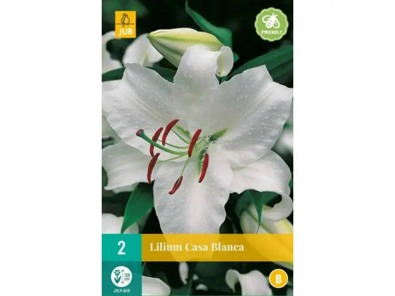 De witte oriëntaalse lelie ‘Casablanca’ is een prachtige tuin- en snijbloem die tot 120 cm hoog kan worden. Ze komen goed tot hun recht in groepen tussen vaste planten en struiken. Ze kunnen na de bloei gewoon in de grond blijven voor jaarlijkse bloei. Perfect voor bloempotten of plantenbakken, met een plantdiepte van 10-15 cm in luchtige, vochtdoorlatende grond. Bescherm ze tegen wind en geef ze een zonnige plek. Plant ze in het voorjaar (april-mei) of in het najaar (oktober-november) en bescherm ze bij vorst met bladeren of takken. Verplant ze om de 3-4 jaar voor nieuwe bloei. Let op voor het oranje leliekevertje, dit is een grote vijand van de lelie!