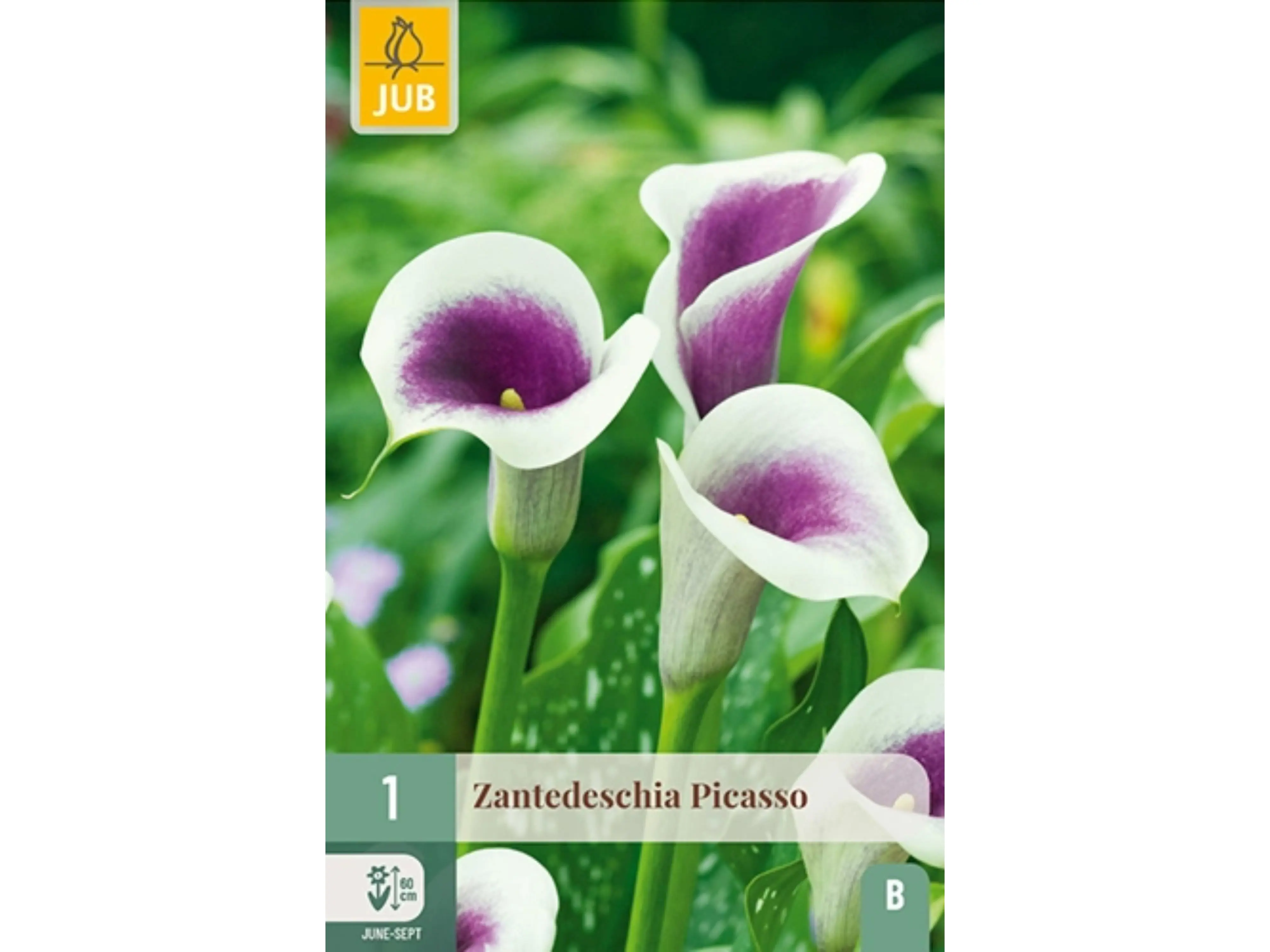 De Zantedeschia ‘Picasso’ is een bijzondere plant met wit-paarse accenten en kan zowel binnen als buiten worden geplant. Begin met de knol in een pot met goede aarde en zet de plant direct in het volle licht. Regelmatig water geven stimuleert de groei, waarbij eerst het blad verschijnt en daarna de opvallende bloemen.