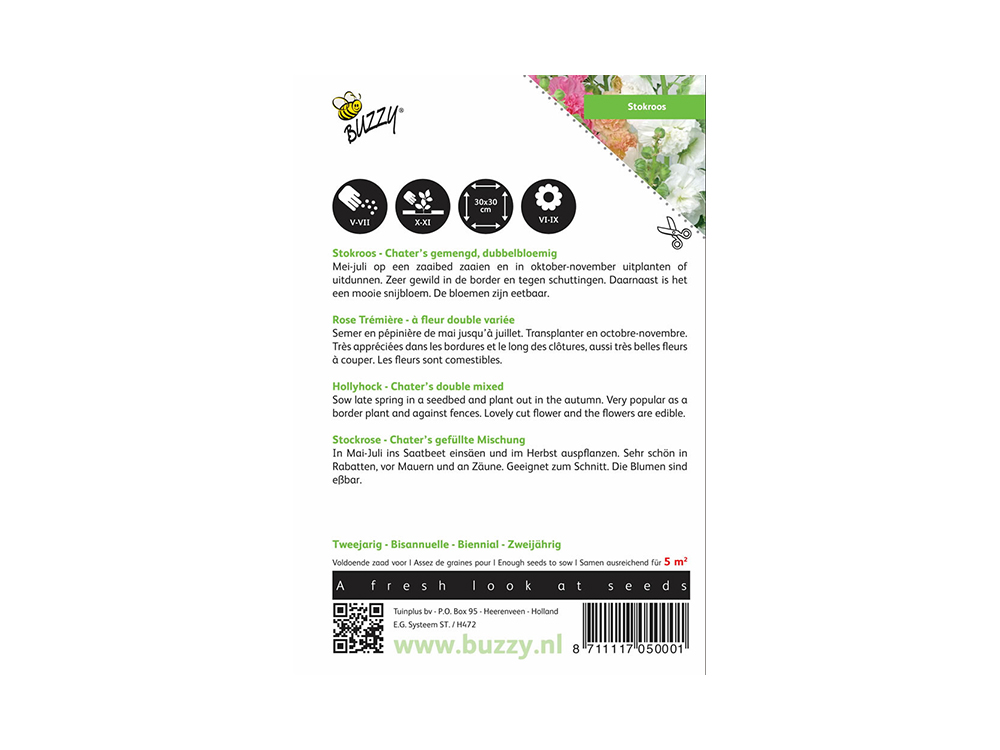Stokrozen als dit tweejarige mengsel werden vroeger Althaea genoemd, nu heten ze Alcea rosea. Meestal zijn het kruisingen tussen verschillende soorten. Stokroos Chater's dubbelbloemig levert planten tot 180 cm hoog, die prachtig dubbelbloemig bloeien in allerlei tinten. Zeer gewild in de border en tegen schuttingen, echter ook mooie snijbloem. De bloemen zijn eetbaar.