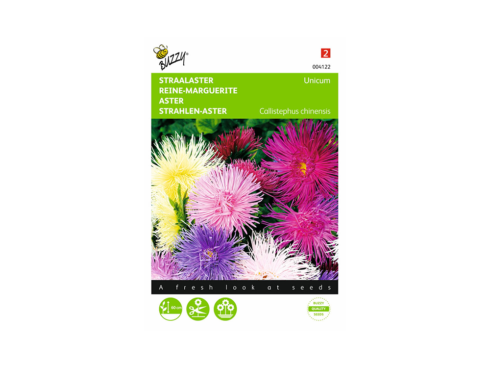 Zomeraster Unicum is een mix van halfhoge, éénjarige asters in allerlei warme pasteltinten. Vanwege de fijne bloemblaadjes worden ze ook wel straalasters genoemd. Ideaal voor in perken, borders, maar kan tevens gebruikt worden als snijbloem.