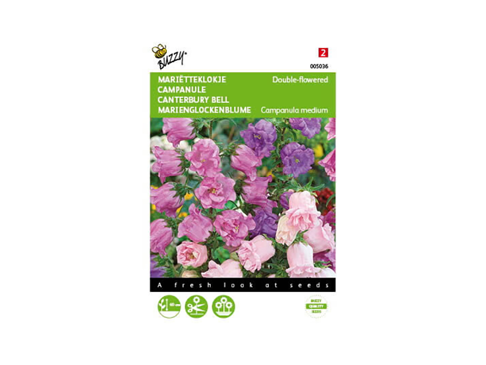 Deze tweejarige klokjesbloemen bloeien rijk met tot 5 cm grote klokjes. Het zijn zeer dankbare zomerbloeiers en prima snijbloemen. De enkele bloemen van dit mengsel vertonen purperen, lila, roze en crème-witte tinten.