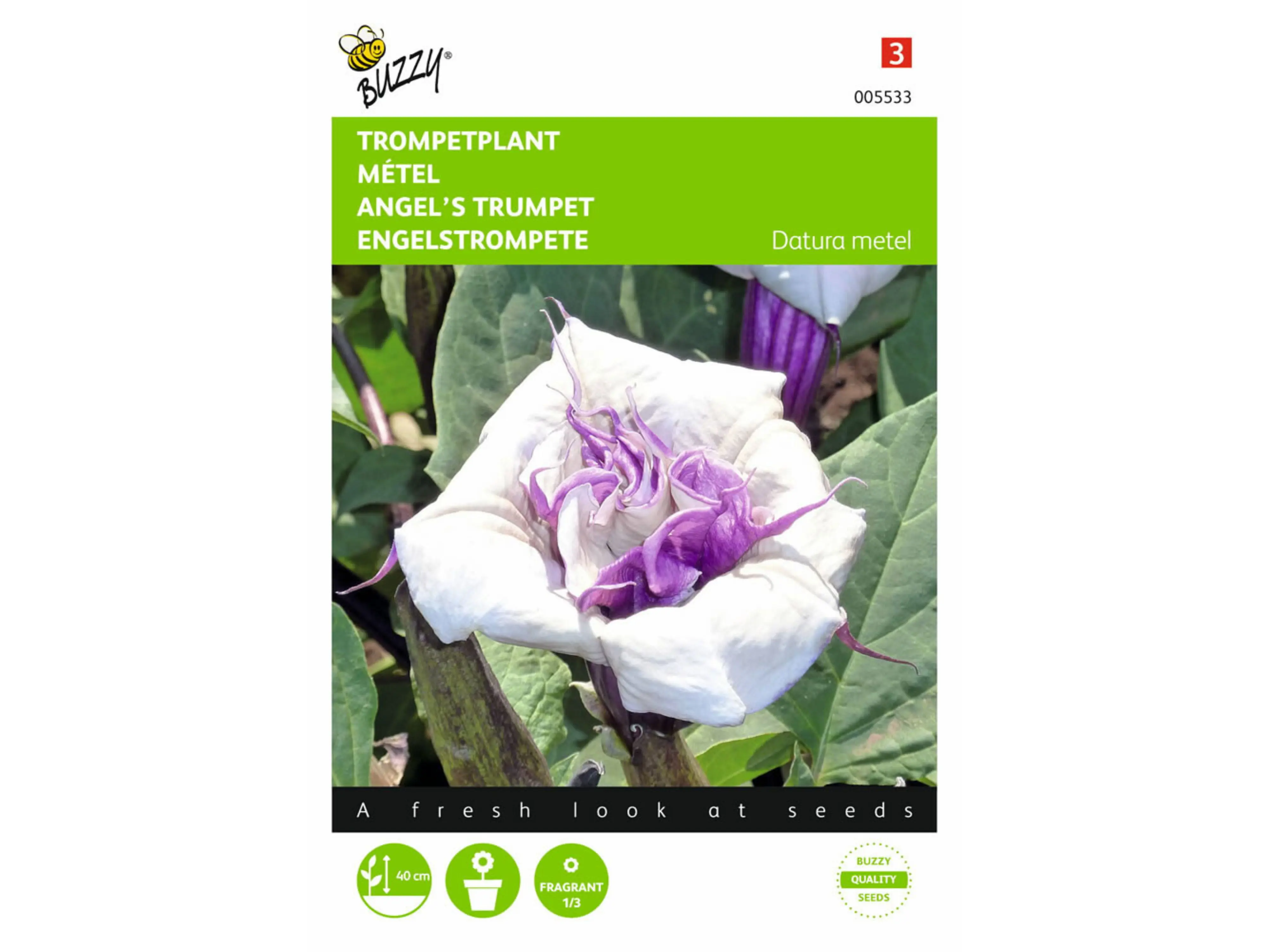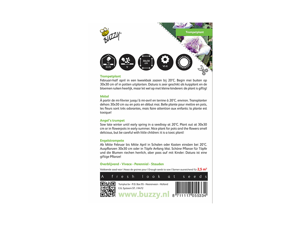 Zaden van de dubbelbloemige paarse Datura of trompetplant, zeer geschikt als kuipplant en de bloemen geuren heerlijk! Let wel op met kleine kinderen wanr de plant is giftig!