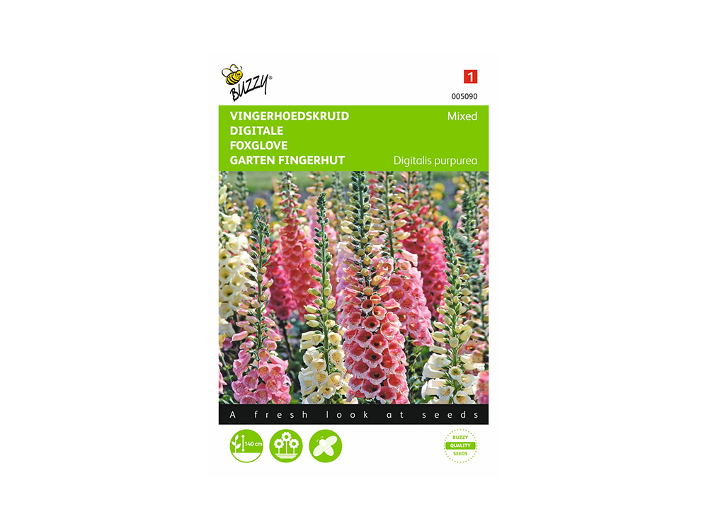 Dit vingerhoedskruid is een heel mooi mengsel met fijne kleurschakeringen. De tot wel 5 cm grote bloemen in lange trossen zijn aan de binnenkant gespikkeld. Het eerste jaar wordt alleen een laagblijvende bladrozet gevormd. De enorme bloeistengel ontstaat in het tweede jaar. Past uitstekend in een verwilderde tuin en zaait zich geweldig uit.