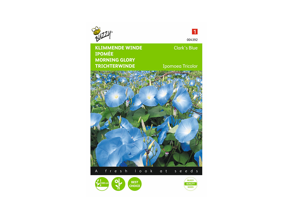 Klimmende Winde Clark's Blue, pronkwinde of dagbloem zijn allemaal namen voor deze schitterende bloeiende éénjarige klimplant. De klimplant wordt gemakkelijk 3 meter hoog en bloeit fantastisch in blauwe kleuren. De bloemen zijn groot trechtervormig.