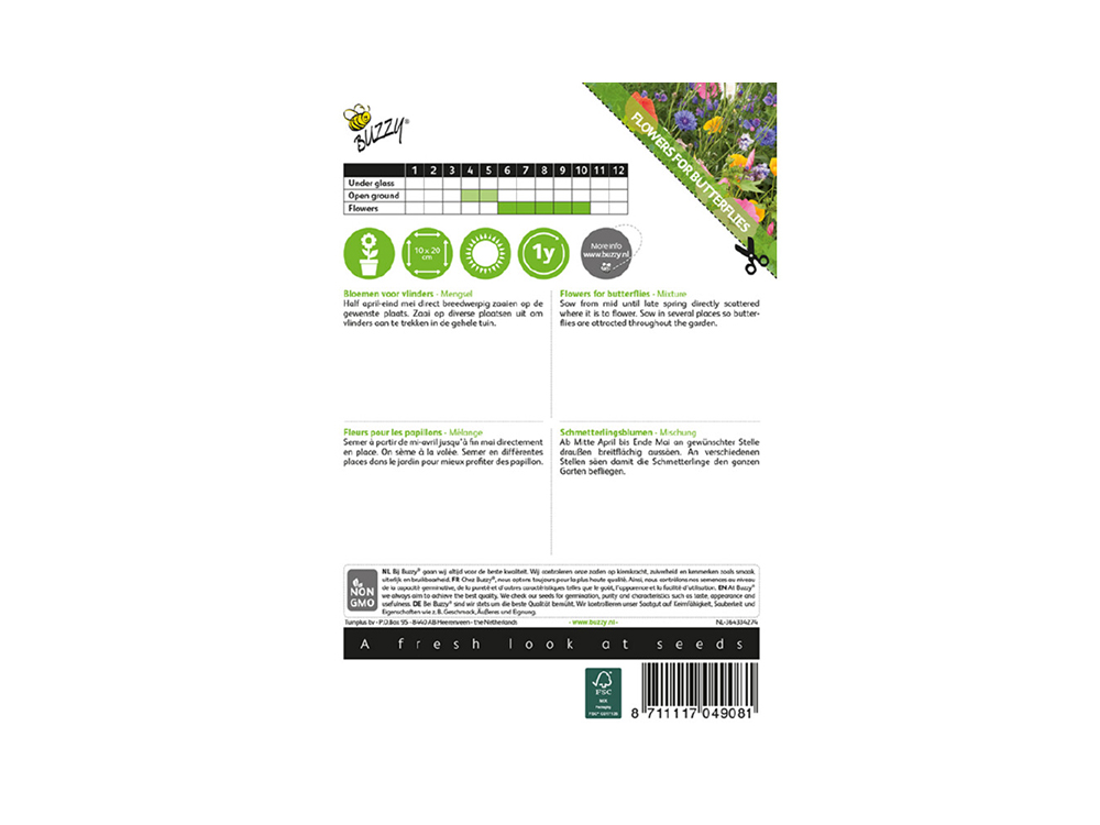 Dit mengsel geeft snel een bloementapijt op een open plek in jouw tuin. Dit mengsel bevat eenjarige planten welke een bijzondere aantrekkingskracht op vlinders en insecten hebben. Het effect is fantastisch. En niet alleen dit jaar maar ook volgend jaar, want de planten zaaien zichzelf uit. Laat alle bloemen volledig uitbloeien zodat ze rustig zaad kunnen vormen.