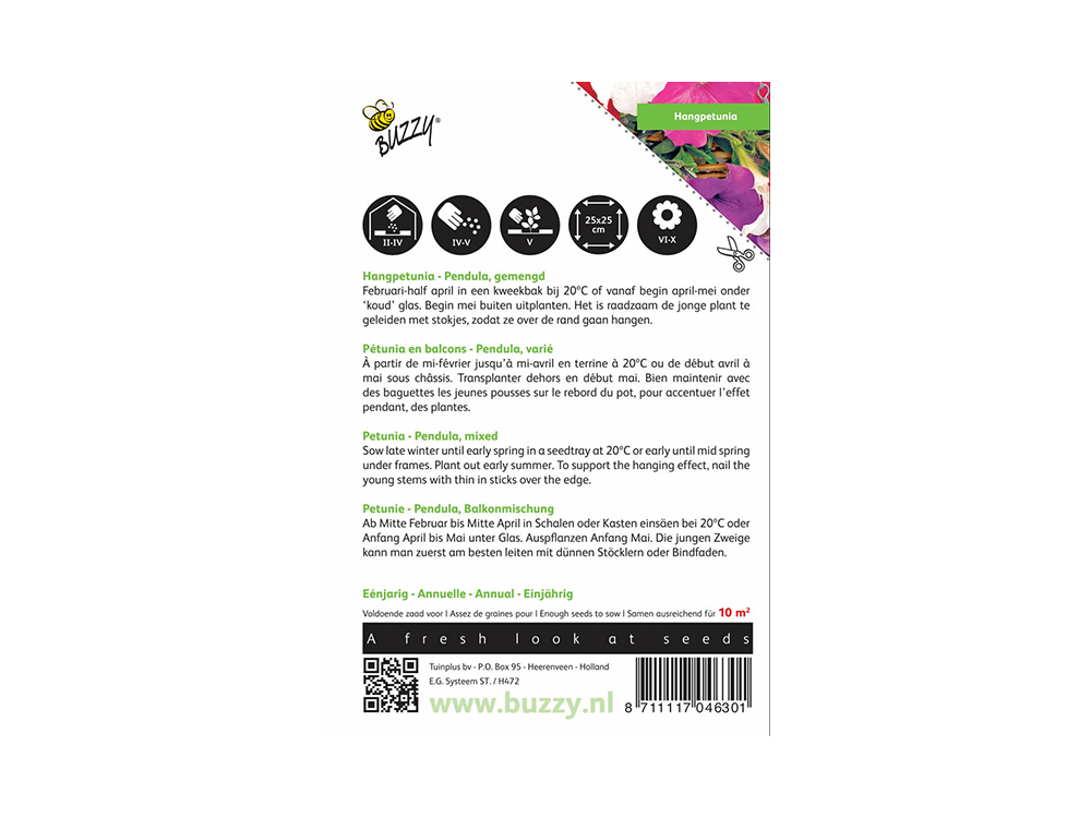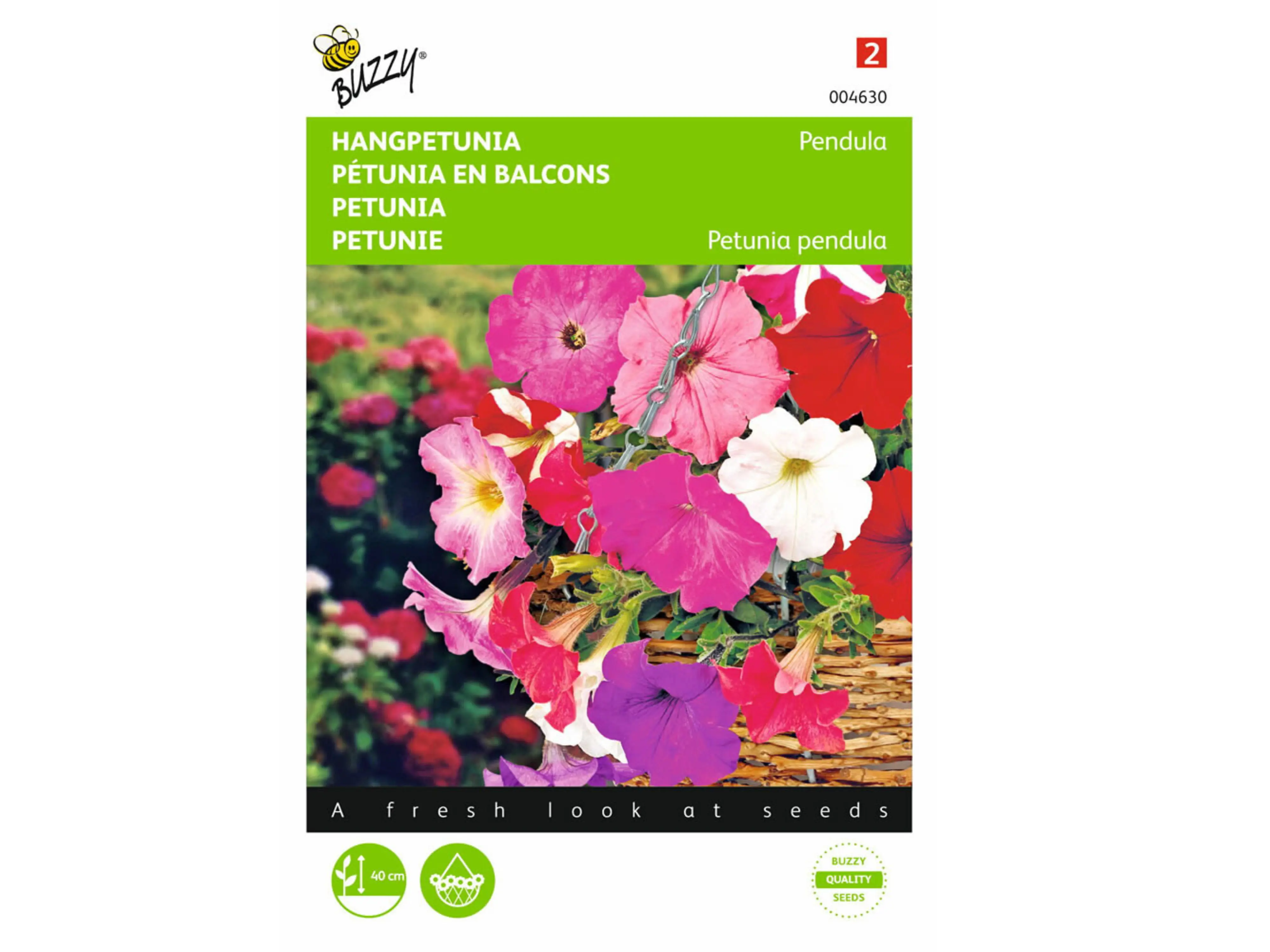 Petunia pendula, een éénjarige hangpetunia die bloeit met een mix van witte, rode, roze en lila tinten. Is veelbloemig en geeft enkele bloemen. Uitermate geschikt voor hangingbaskets.