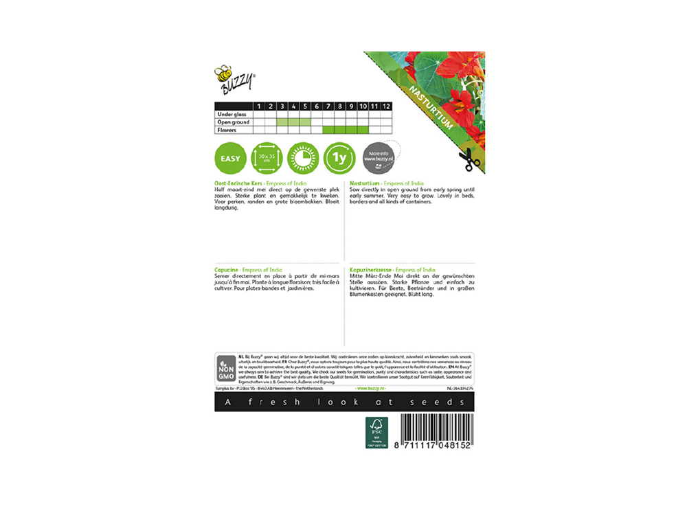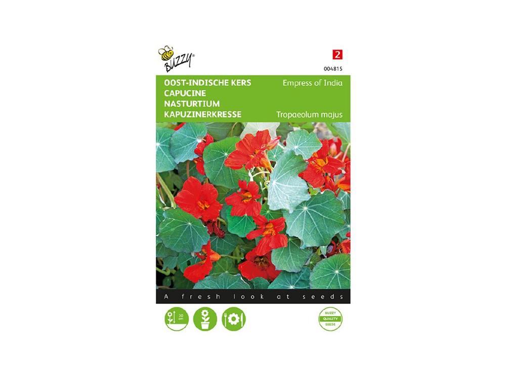 Oost-Indische kers Empress of India blijft laag, rankt niet of nauwelijks en heeft rode bloemen die goed boven het blad uitkomen. De kleuren zijn vrolijk en fris. Ook geschikt voor grote bloembakken.