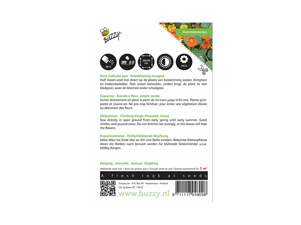 Oost-Indische kers enkelbloemig gemengd is een eenjarige klimplant in allerlei fijne tinten. De planten klimmen langs een steun tot meer dan 2 meter hoog. Het kan tevens gebruikt worden als bodembedekker. De bloemen zijn eetbaar en geven kleur aan jouw gerechten.