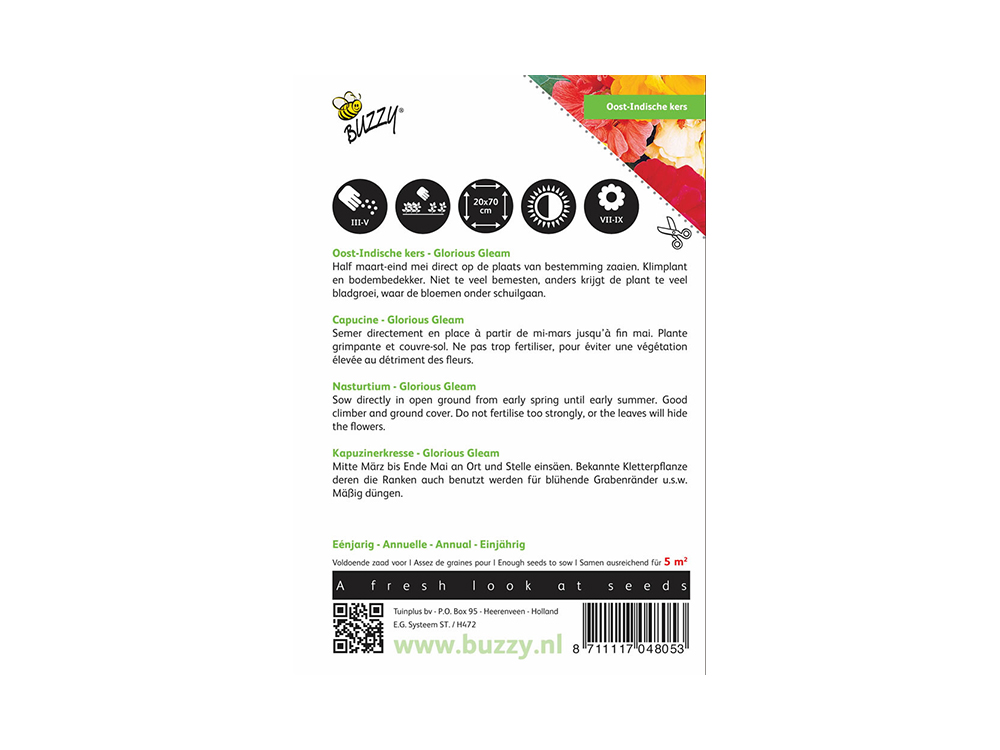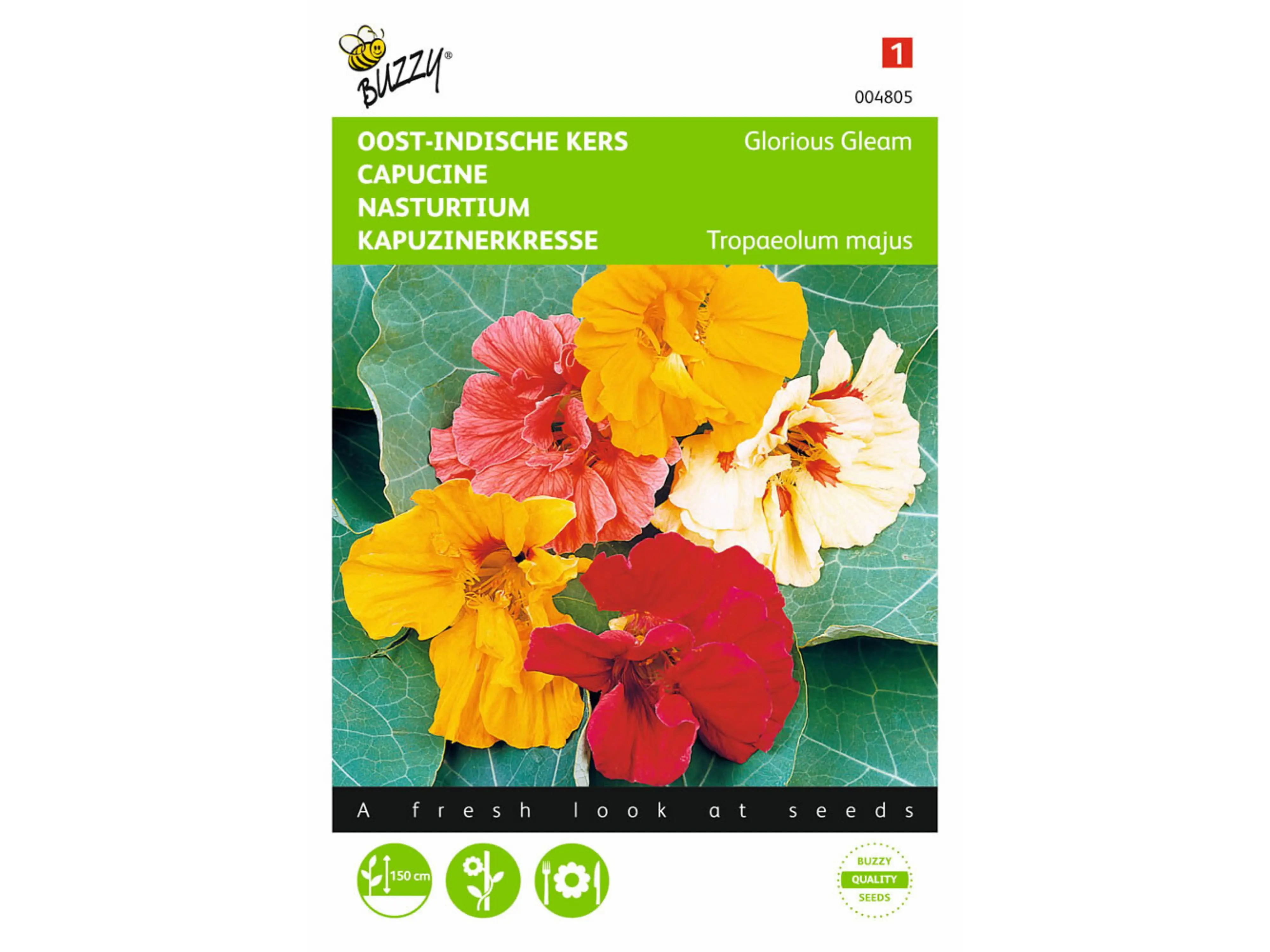 Oost-Indische kers Glorious Gleam is een eenjarige klimplant die langs een steun tot 150 cm hoog kan groeien. De bloemen bloeien in diverse tinten en zijn zelfs eetbaar.