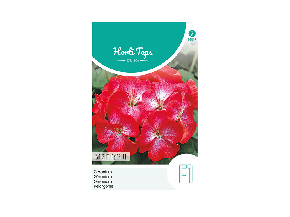 Geranium Bright Eyes F1, de pelargonium beter gekend als de geranium. Het is sinds jaar en dag één van de meest populaire balkonbakplanten! Dit zadenmengsel bestaat uit een prachtige fuchsia soort met bleker hart, ideaal voor potten, schaal- en perkbeplanting.