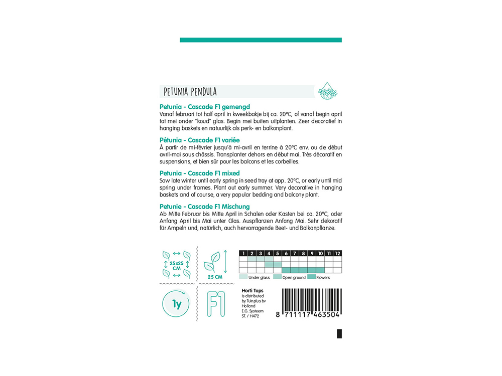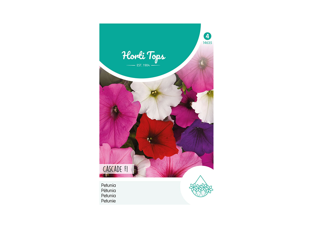 Petunia's zijn al sinds jaar en dag zeer geliefde balkon en terrasplanten. Ze zijn er in alle geuren en kleuren. Dit Cascade zadenpakketje bestaat uit een bonte kleurenmix van paars, wit en rood. De bloemen zijn zeer decoratief tegen muren, als hangplant, in hanging baskets en als perk- en balkonplant.