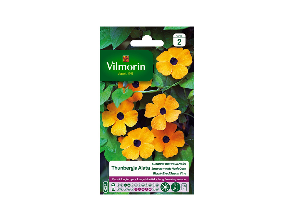 De Suzanne-met-de-mooie-ogen is een opvallende klimplant met een lange bloeitijd. De oranjegele bloemen met hun donkerbruine 'oog' in het hart trekken meteen de aandacht.