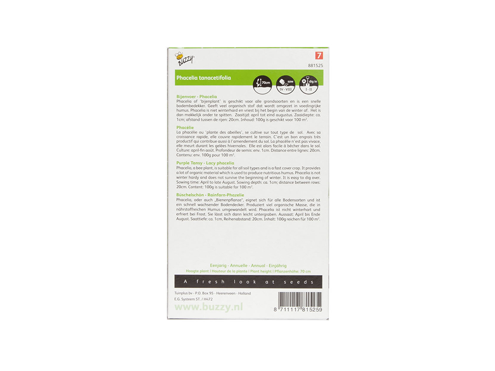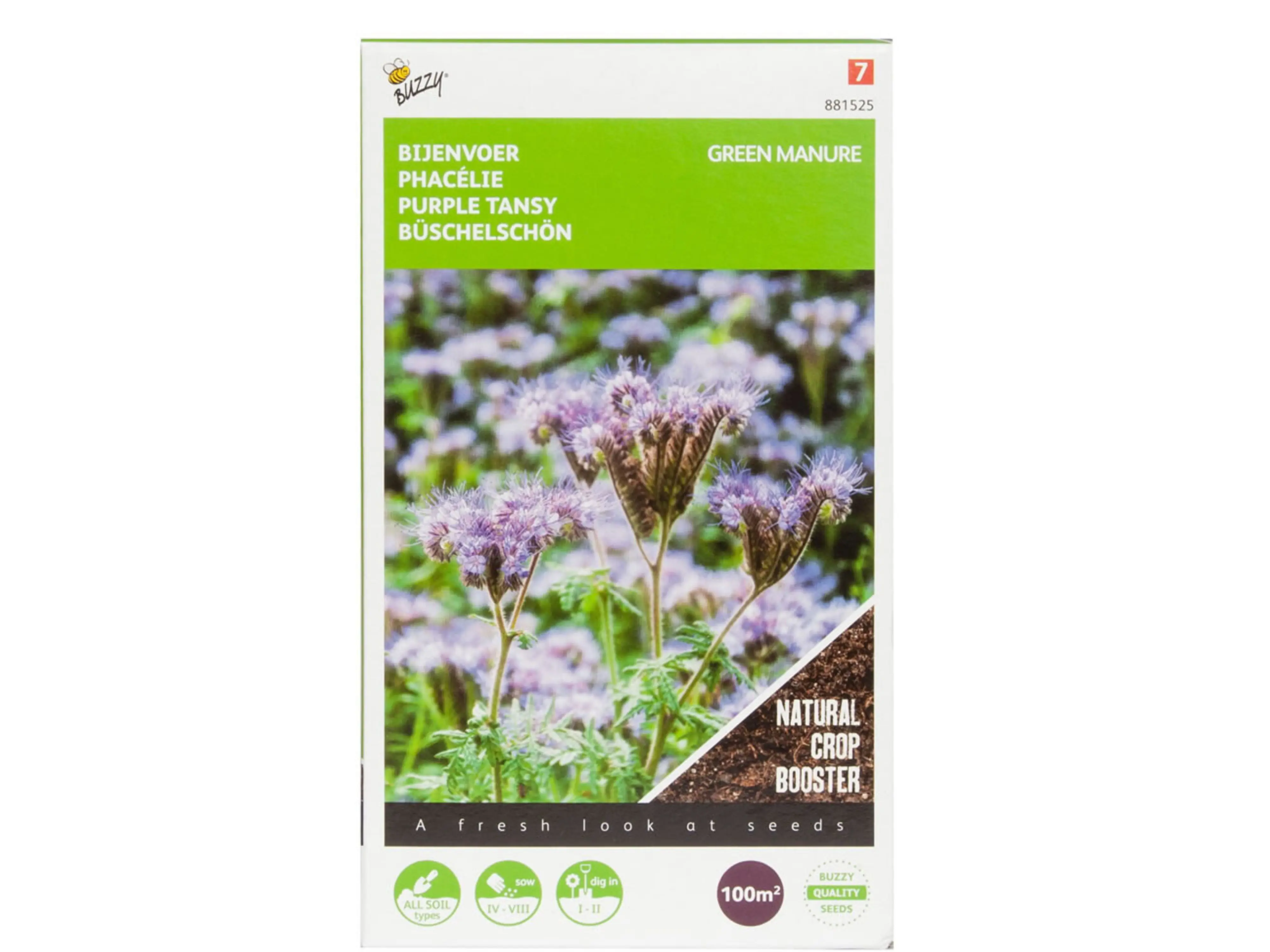 Phacelia (Phacelia tanacetifolia) heeft sterk geparfumeerde bloemen en staat daarom bekend als topplant voor bijen en hommels. Het is een zeer snelle bodembedekker die snel wordt omgezet in voedingrijke humus.