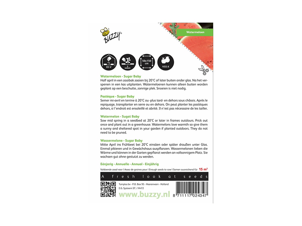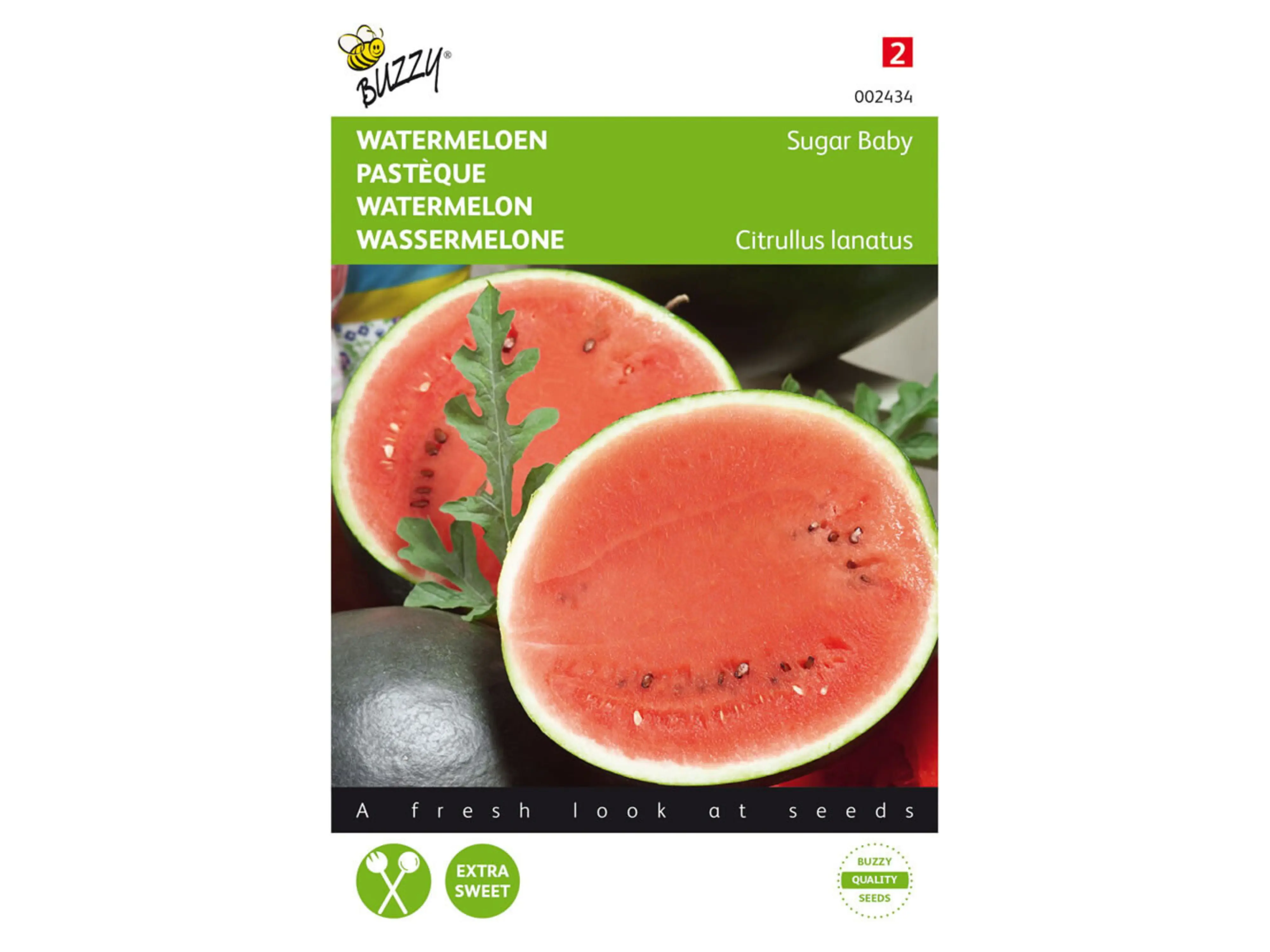 Zaai watermeloen Sugar Baby vanaf half april binnenshuis in een zaaibakje bij 20°C of later buiten onder glas. Na verspenen, in een serre of buiten uitplanten. Watermeloenen kunnen buiten worden geplant, mits op een beschutte, zonnige plek. Men hoeft niet te snoeien.