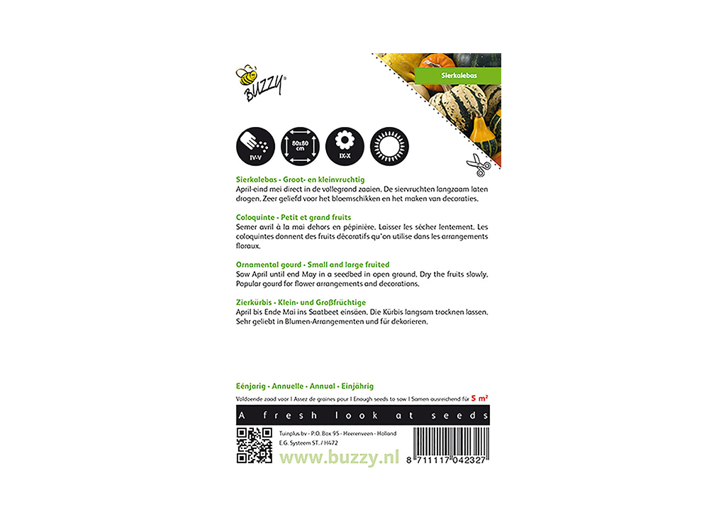 Sierkalebas klein en groot gemengd wordt vooral gebruikt bij het bloemschikken en het maken van decoraties.Zaai sierpompoenen vanaf april/mei direct in de vollegrond.