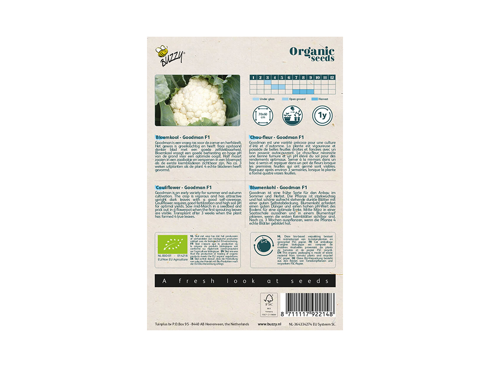 Bloemkool Goodman F1 is een vroeg ras geschikt voor de zomer- en herfstteelt. Het is een groeikrachtig gewas met een fraai opstaand donker blad en vaste roosjes van hoge kwaliteit. Voor een optimale oogst is een goede bemesting en een hoge pH waarde van de grond nodig.