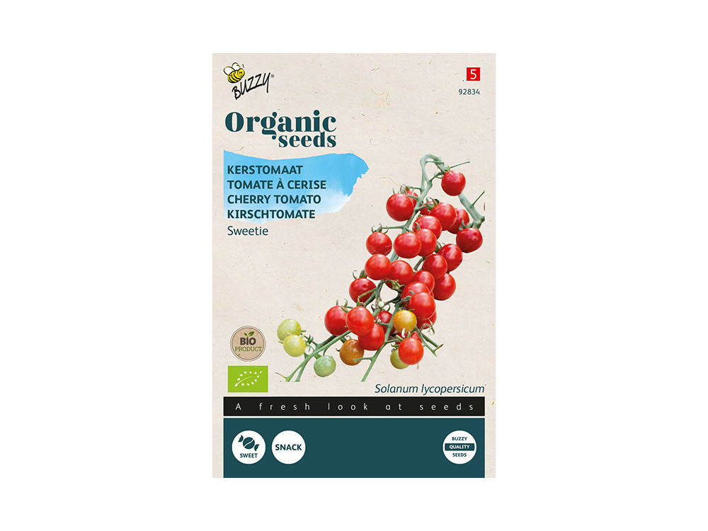 Kerstomaat Sweetie levert een overvloed aan heerlijk zoete minitomaatjes. Het is een groeikrachtig ras dat ook geschikt is voor de buitenteelt. Voorzaaien kan vanaf eind februari tot eind mei. Van zodra de plantjes groot genoeg zijn, uitplanten onder glas of buiten vanaf mei. Verwijder regelmatig de dieven om een mooie structuur te behouden.