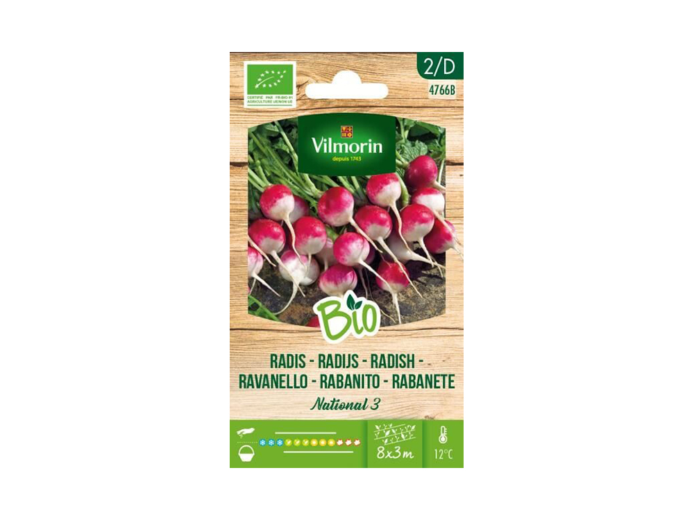 Kweek zelf biologische radijsjes in jouw moestuin met de BIO zaden van Vilmorin. Radijs National 3 is een traditionele variëteit die lang zijn smaak behoudt. Ze hebben een milde smaak, zijn mooi rond van vorm en hebben een fris wit/vermiljoenrode kleur.