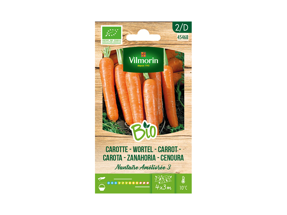 Kweek je eigen biologische wortelen met de BIO zaden van Vilmorin. Wortel Nantaise Améliorée 3 is een traditionele variëteit dat smakelijke, halflange en cylindrische wortelen vormt met een dieporanje kleur. De wortelen zijn van zeer goede kwaliteit, ideaal voor de zomerteelt.