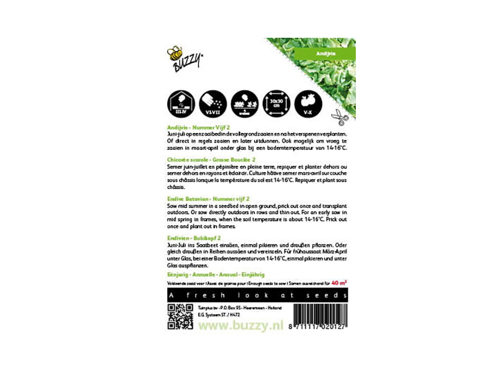 Andijvie Nummer Vijf is een bladgroente die ideaal is voor voorjaars- en zomerteelt. Zaai niet bij temperaturen onder 15°C om doorschieten te voorkomen.