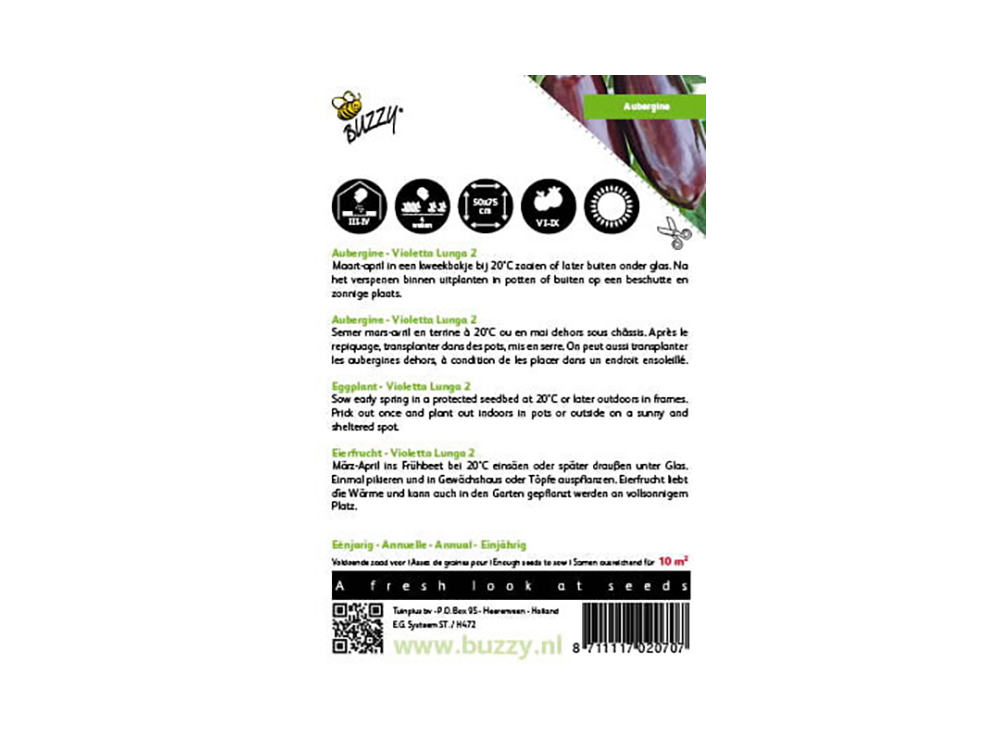 Zaai aubergine van maart tot april in een zaaibakje bij 20°C of later buiten onder glas. Na het verspenen binnen uitplanten in potten. Het kan ook gewoon buiten worden uitgplant op een beschutte en zonnige plek; voorzie steunmateriaal.