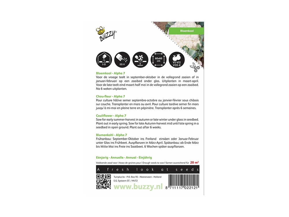 Bloemkool Alpha 7 is ideaal voor de zomerteelt, met grote, stevige, witte bloemkolen. De planten hebben voldoende blad om de kool goed te bedekken en zijn bestand tegen hoge zomertemperaturen.