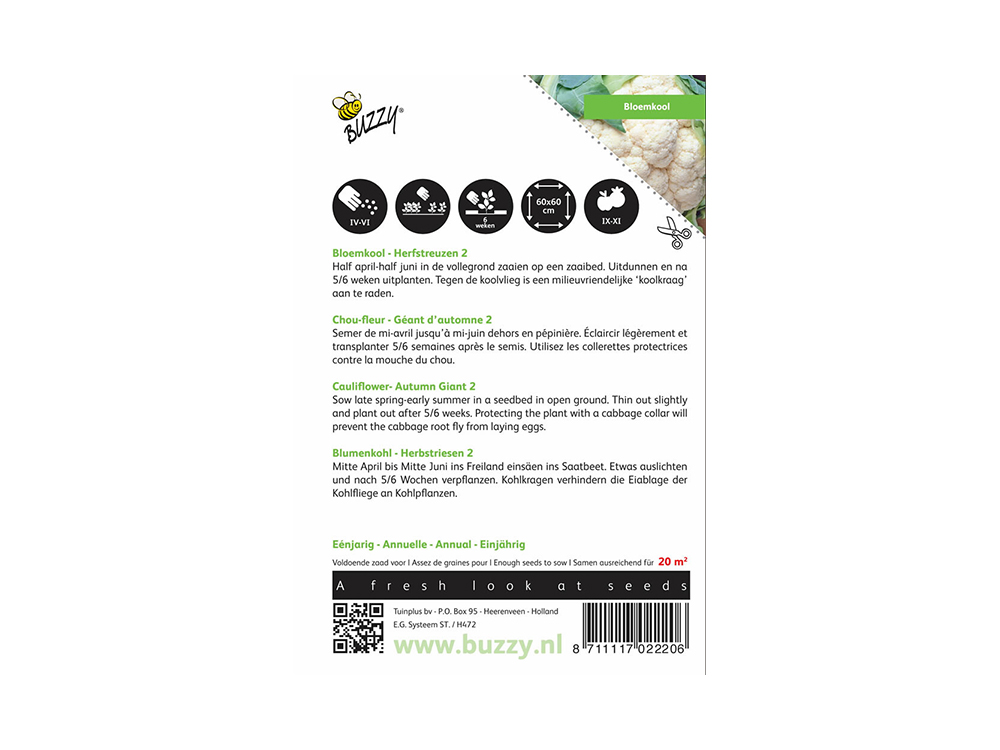 Het bloemkoolras Herfstreuzen 2 levert grote, mooie witte bloemkolen met een uitstekende smaak. De planten worden groot en ontwikkelen veel blad.