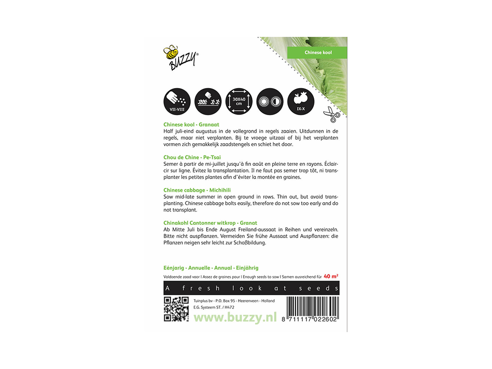 Zaai Chinese kool tussen half juli en eind augustus direct in de vollegrond, in rijen van 50 cm. Zaai zo dun mogelijk en dun later uit tot de planten 40 cm uit elkaar staan. Belangrijk: zaai niet eerder dan half juli, want dat vergroot de kans op 'schieten', waarbij de plant bloemen vormt in plaats van kolen.