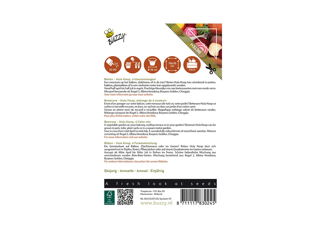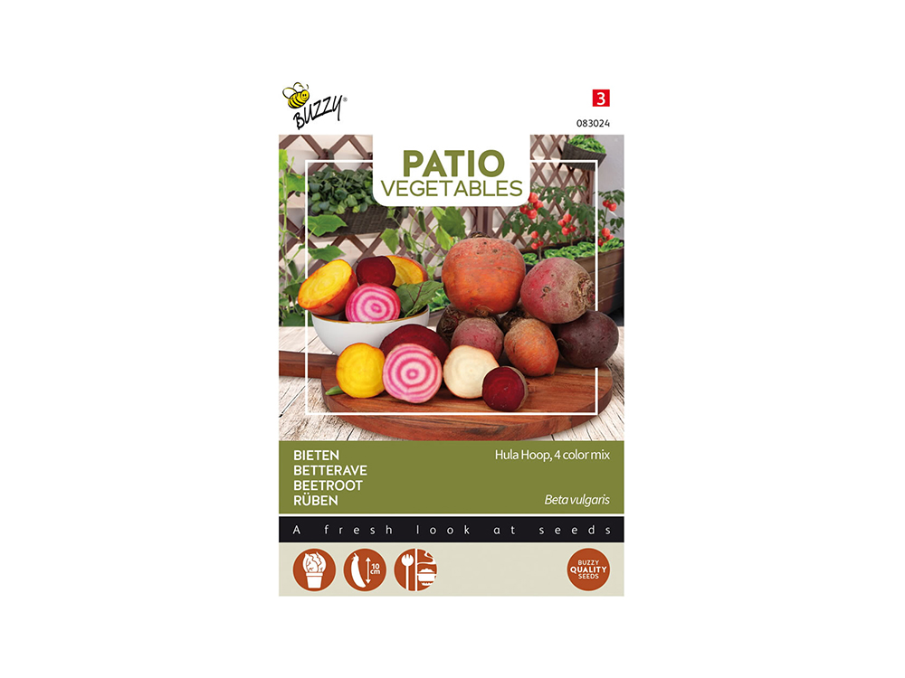 Bieten Hula Hoop is een prachtige kleurenmix van vier verschillende ronde bieten: Albina Verduna (wit), Burpees Golden (geel), Kogel 2 (rood) en Chioggia (rood-wit). Deze kleurrijke variëteit maakt elk gerecht aantrekkelijk en de bieten zijn ook geschikt voor mini-bietjes.