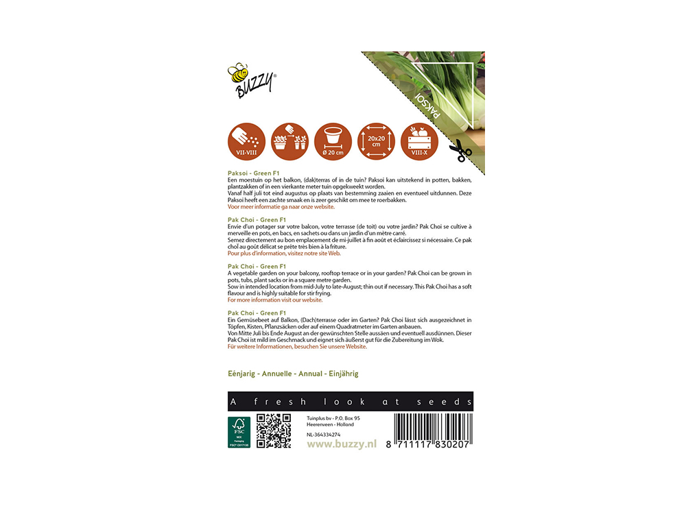 Paksoi kan je zelf kweken in potten van min. Ø 20 cm, bakken, plantzakken, een vierkante meter tuin of in de volle grond. Zaaien kan vanaf half juli tot eind augustus op de plaats van bestemming, dun eventueel uit. Oogsten kan vanaf augustus tot oktober.