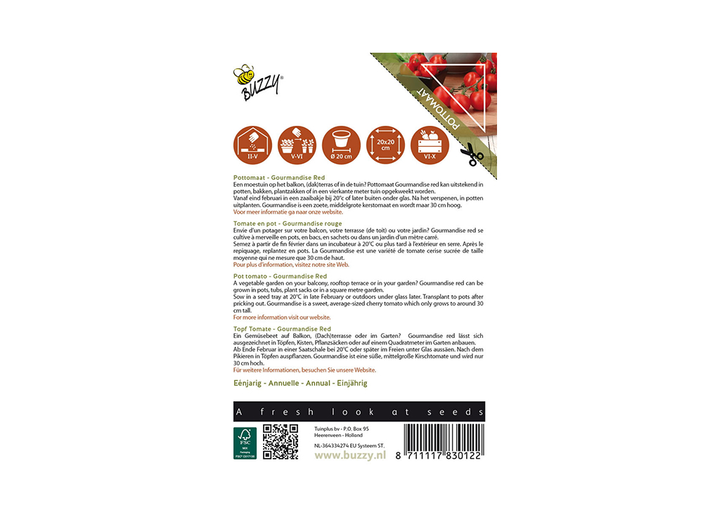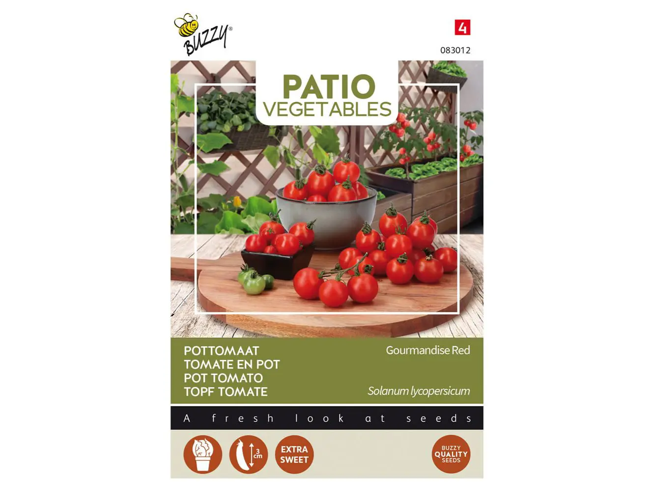 Tomaten kweken in pot kan perfect met de pottomaat Gourmandise Red zaden. Een compact ras met extra zoete middelgrote kerstomaten, heerlijk als tussendoortje, aperitiefhapje of in salades.