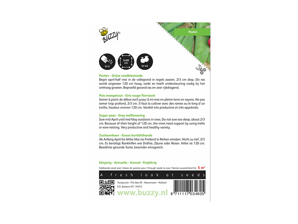 Van begin april tot half mei kan je deze zaden in de volle grond zaaien, in rijen en op een diepte van 2-3 cm. Dit ras is een klimplant en groeit het beste met ondersteuning van gaas; de plant kan ongeveer 120 cm hoog worden. Beproefd gezond ras, zeer rijkdragend.
