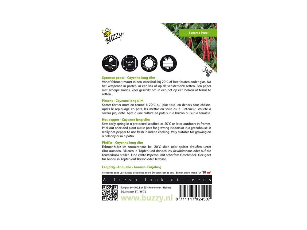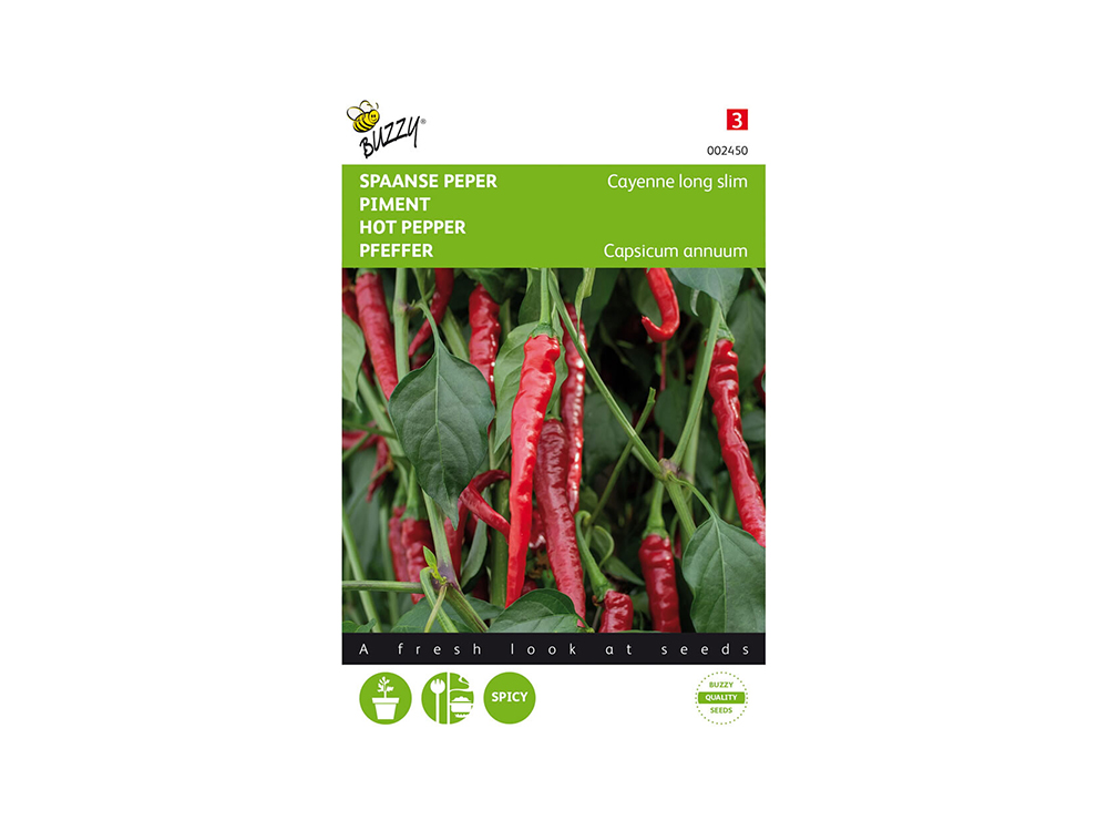 Pepers De Cayenne zijn pittige Spaanse rode pepers die eerst groen zijn en vervolgens vuurrood kleuren. Ze zijn perfect voor het toevoegen van een scherpe kick aan gerechten zoals chili con carne en Indonesische gerechten. Dit ras doet het uitstekend in een pot op het balkon of terras.