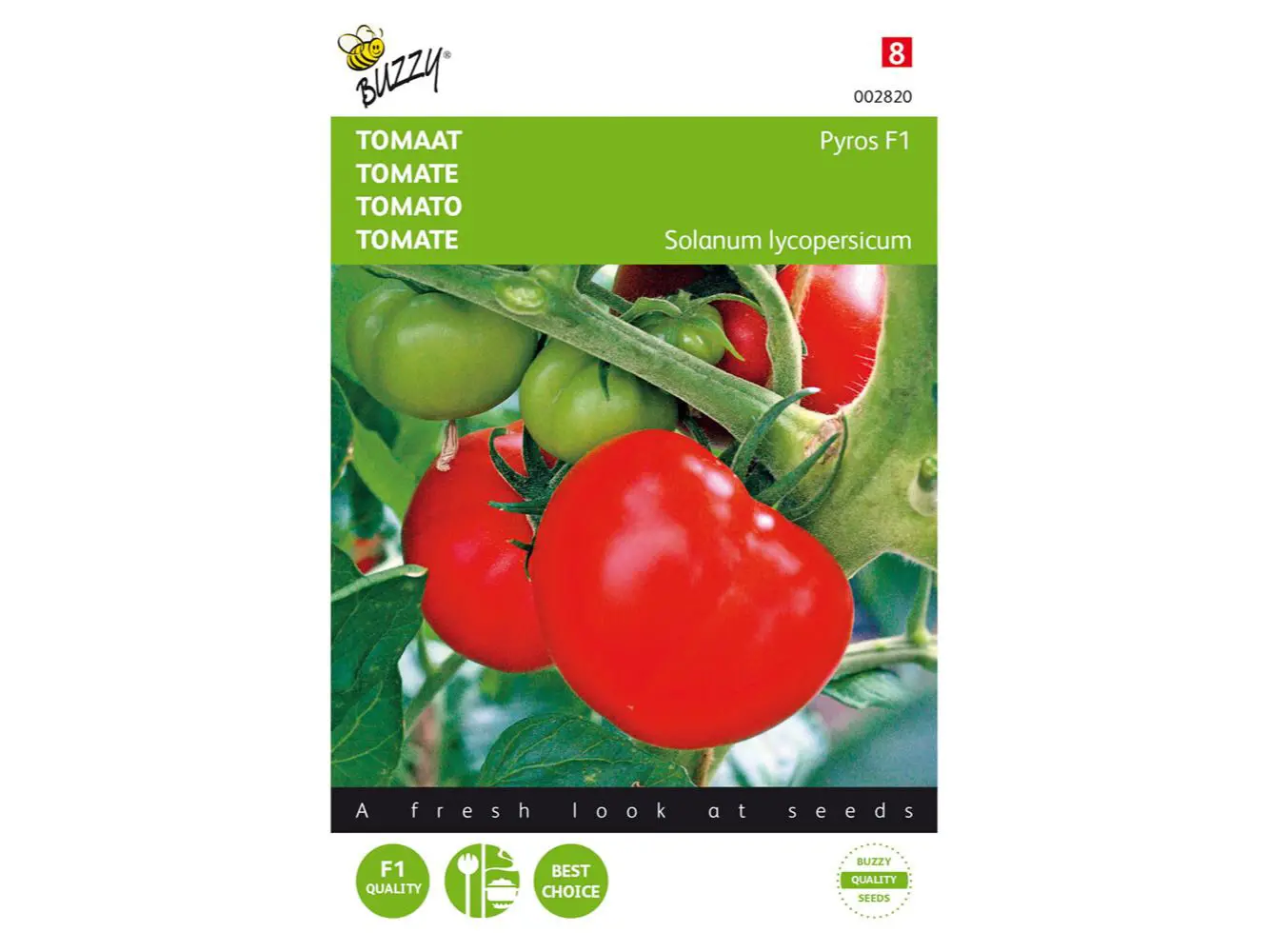 Zaai tomatenzaden van de Pyros F1 hybride vanaf eind februari in een zaaibakje bij 20°C of later buiten onder glas. Na het verspenen kun je ze uitplanten in een kasje of in potten.