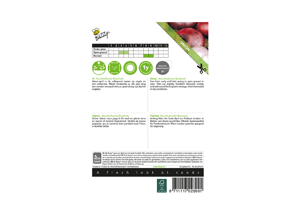 Zaai de zaden van de Noordhollandse Bloedrode uien van begin maart tot eind april in de vollegrond in rijen en dun ze iets uit. Deze pikant smakende ui kan zeer lang worden bewaard, mits je ze goed laat drogen voor het binnenhalen.