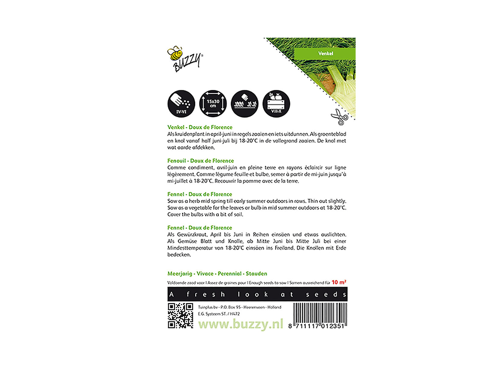 Teel venkel in zomer en najaar, omdat vroege teelt de kans op bloei verhoogt. Zaai onder glas vanaf maart en verspeen na vier weken, of zaai direct in potjes om bloei te voorkomen. Oogst vanaf juli. Voor herfstteelt zaai je van juni tot half juli, met een afstand van 45 x 25 cm. Venkel heeft 80-100 dagen nodig om te rijpen.