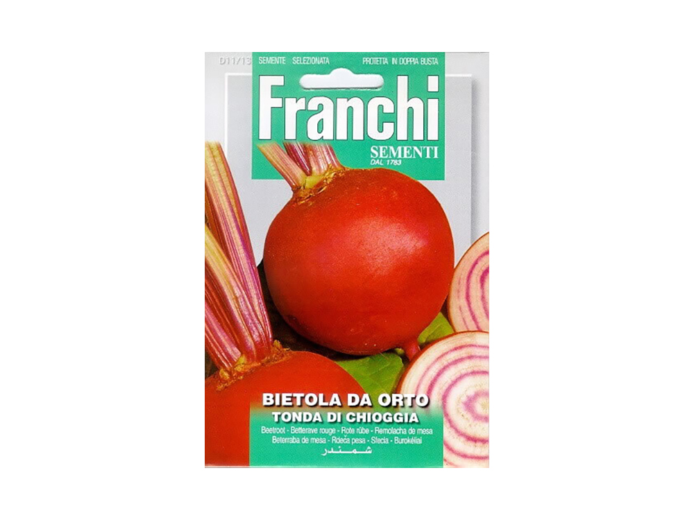 Bietola Tonda Di Chioggia is een zeer vroege variëteit met groen blad en rode aders. De ronde biet heeft een lichtrode schil en wit vruchtvlees met roze cirkels.