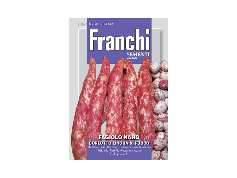 Stamslaboon 'Fagiolo Nano Borlotto de Fucco' is een zeer populair Italiaans ras van lage slabonen. De peulen van deze 'Fire Tongue' variant bevatten 5-6 gevlekte bonen.