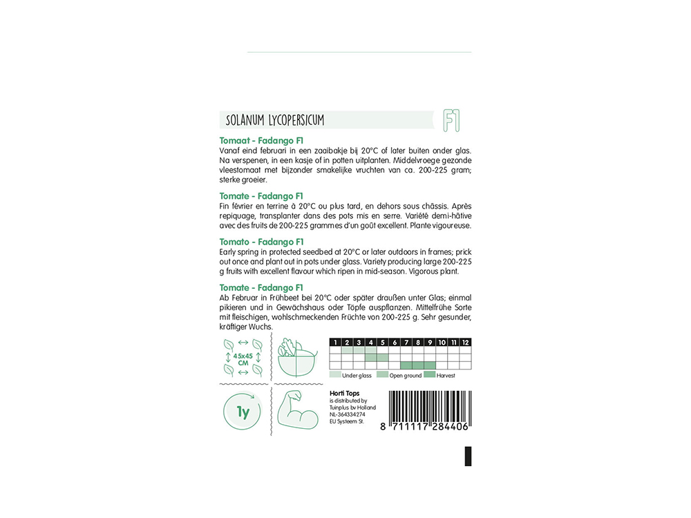 Tomaat Fadango F1: zaai vanaf eind februari in een zaaibakje. Zaai buiten onder glas als de temperatuur minimaal 20°C is, of iets later. Na verspenen kunnen ze in potten worden uitgeplant. Deze middelvroege, gezonde vleestomaat groeit krachtig en heeft een bijzondere smaak, met vruchten van rond de 200 à 225 gram.
