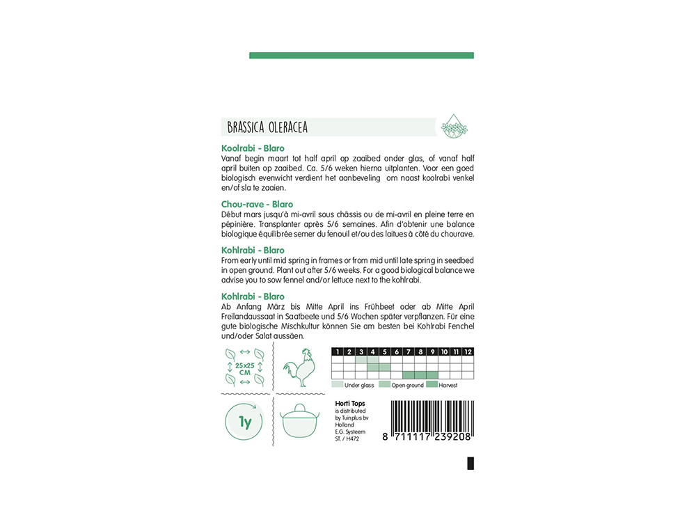Zaai koolrabi Blaro vanaf begin maart tot half april onder glas. Vanaf half april buiten. Uitplanten na 5 tot 6 weken. Plantafstand: 25 cm. Zaai venkel en/of sla naast koolrabi voor een goed biologisch evenwicht.