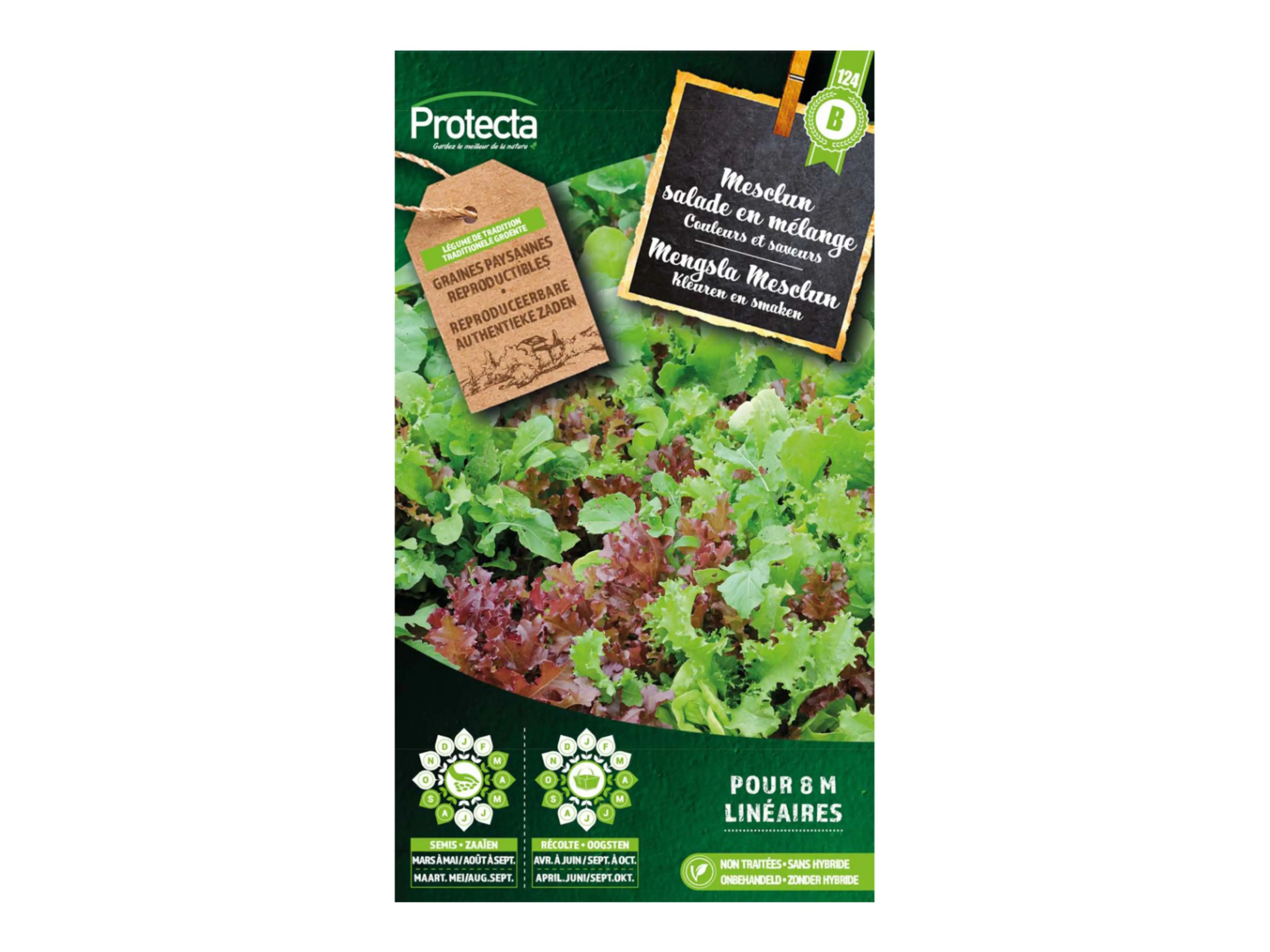 Mengsla Mesclun, een kleurrijk en smaakvol mix van 10 slasoorten voor een echte Mesclun Niçois: krulandijvie, wilde andijvie, bindsla, snijsla, veldsla en paardenbloem. Rucola en waterkers zijn bewust weggelaten om de fijne smaken van de andere soorten volledig tot hun recht te laten komen.