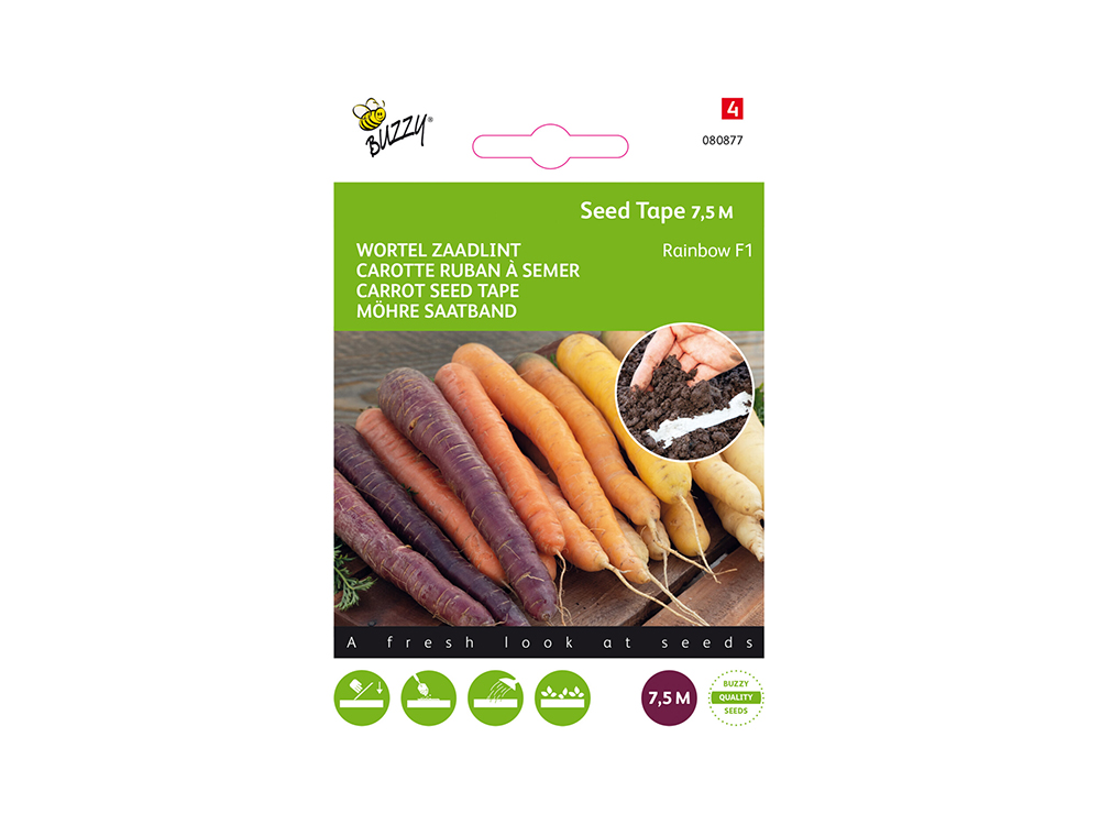 Zaaien wordt gemakkelijk met dit zaadlint van 7,5 meter, ingezaaid met Rainbow-wortelen. De gele tot paarse wortelen zijn een smaakvolle toevoeging aan verschillende gerechten, direct klaar voor gebruik in de tuin.