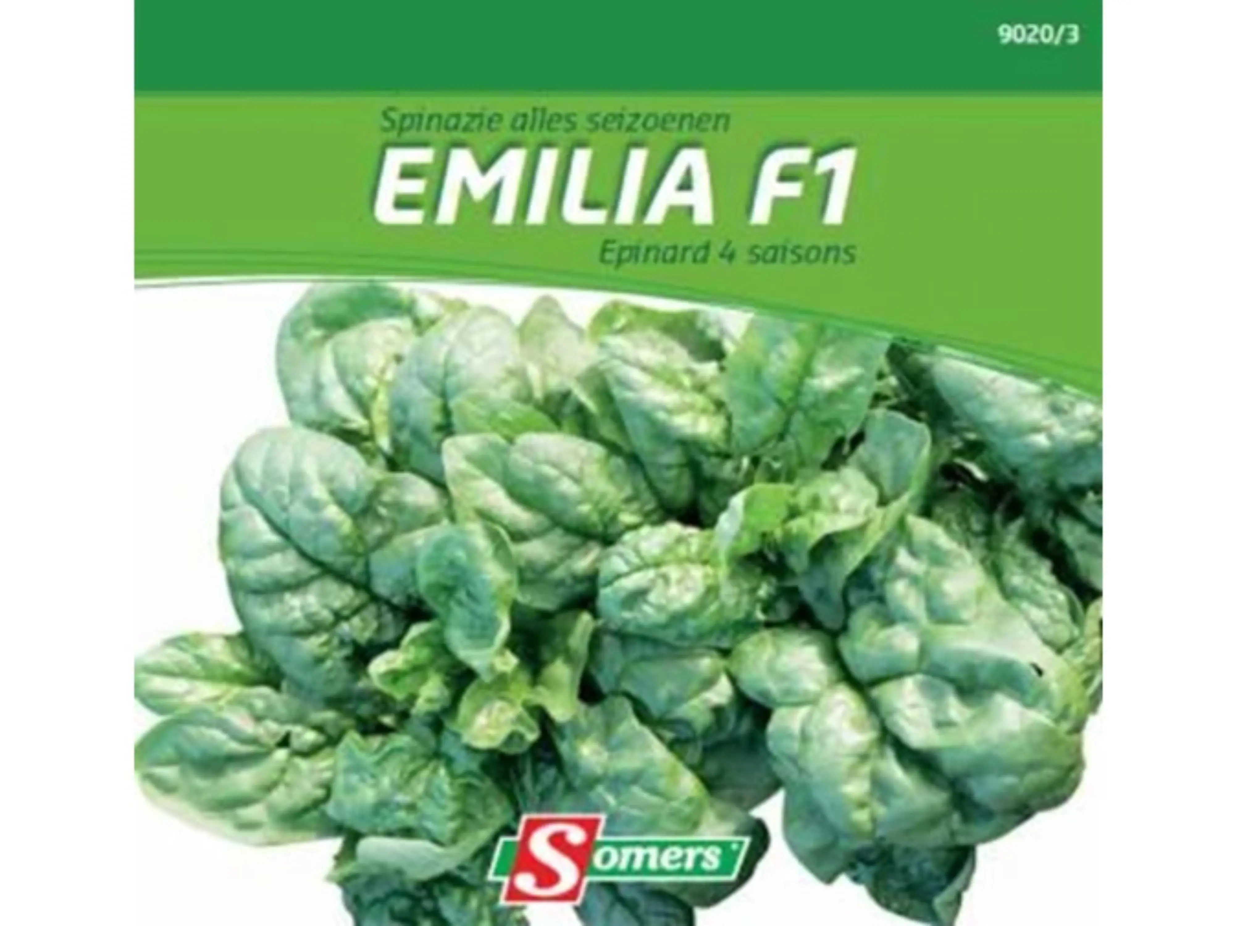 Spinazie alle seizoenen Emilia F1 is een tuindersselectie met donkergroene bladeren, weinig vatbaar voor ziekten. Ideaal voor voorjaars- en herfstteelt.
