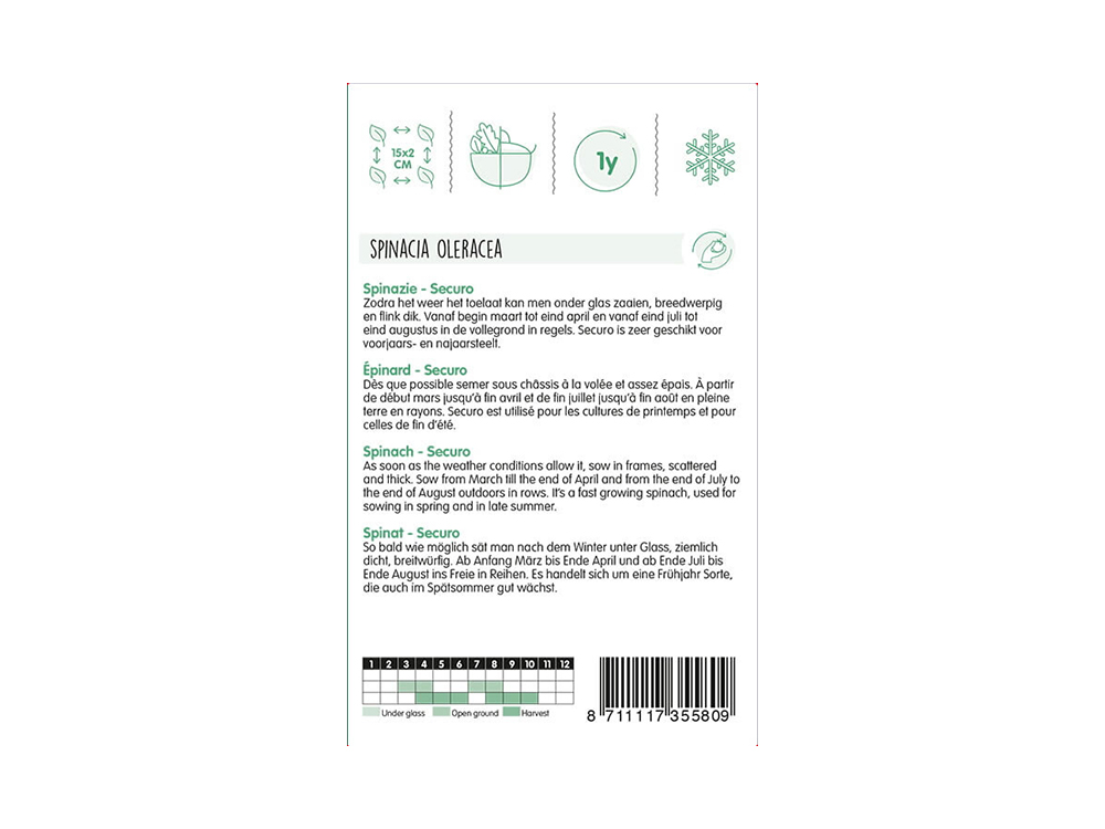 Spinazie Securo is zeer geschikt voor de voor- en najaarsteelt. Zodra het weer het toelaat kan je spinazie Securo zaaien onder glas, breedwerpig en flink dik. Vanaf begin maart tot eind april en vanaf eind juli tot eind augustus in de vollegrond in regels.