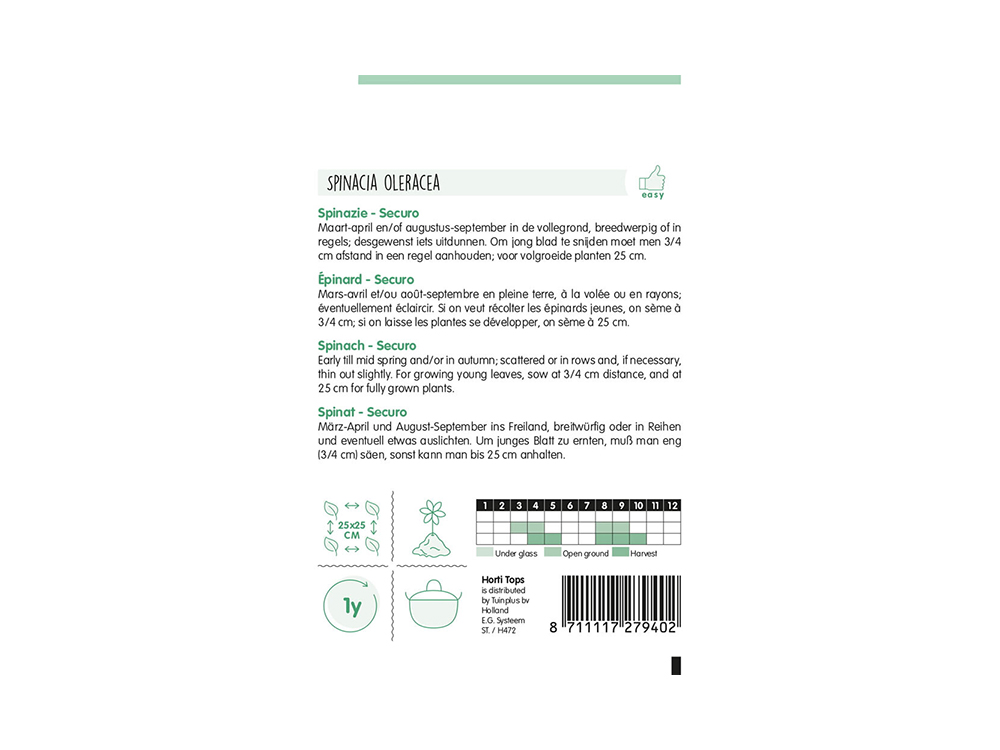 Spinazie Securo Wolfreistent A+B kan jevanaf het weer het toelaat zaaien onder glas, breedwerpig en flink dik. Zaai vanaf begin maart tot eind april en vanaf eind juli tot eind augustus in de vollegrond in regels.