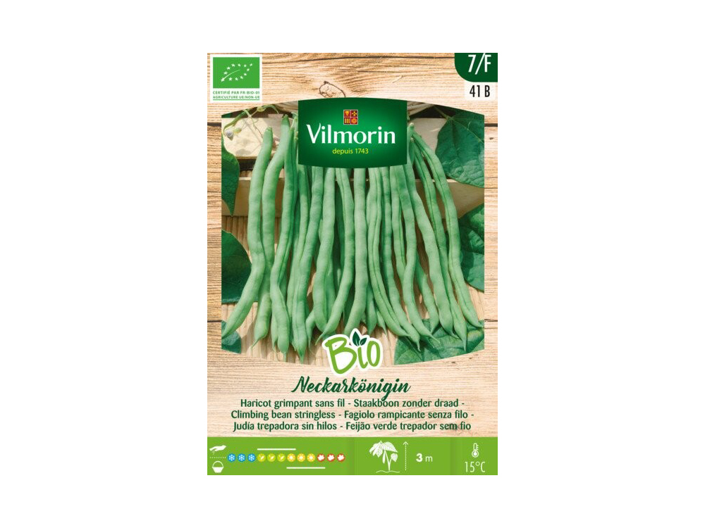 Staakboon Neckarkönigin van Vilmorin is een biologische variëteit met zeer lange en smaakvolle peulen zonder draad. De vlezige peulen zijn ideaal om in te vriezen.